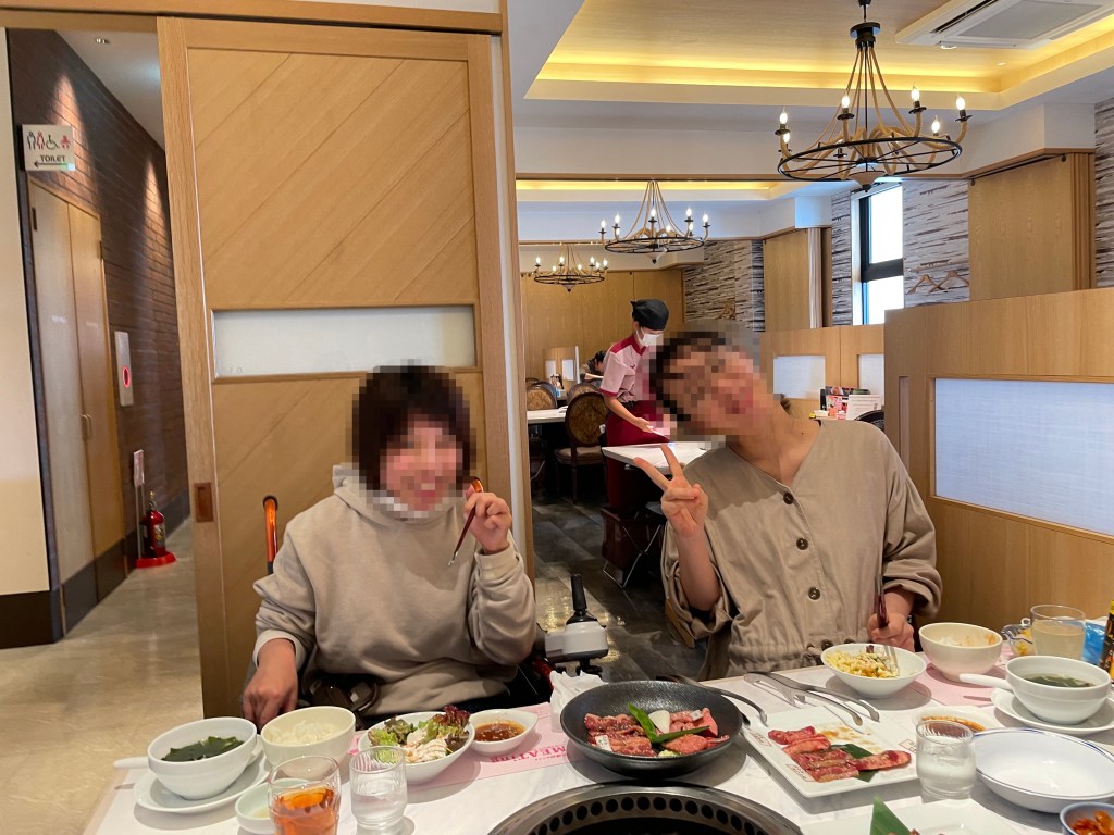 まず焼肉で腹ごしらえ! 女性ということで嫁にも来てもらい、お手伝いしていただきました。(モザイクですが、様子をどうぞ!)