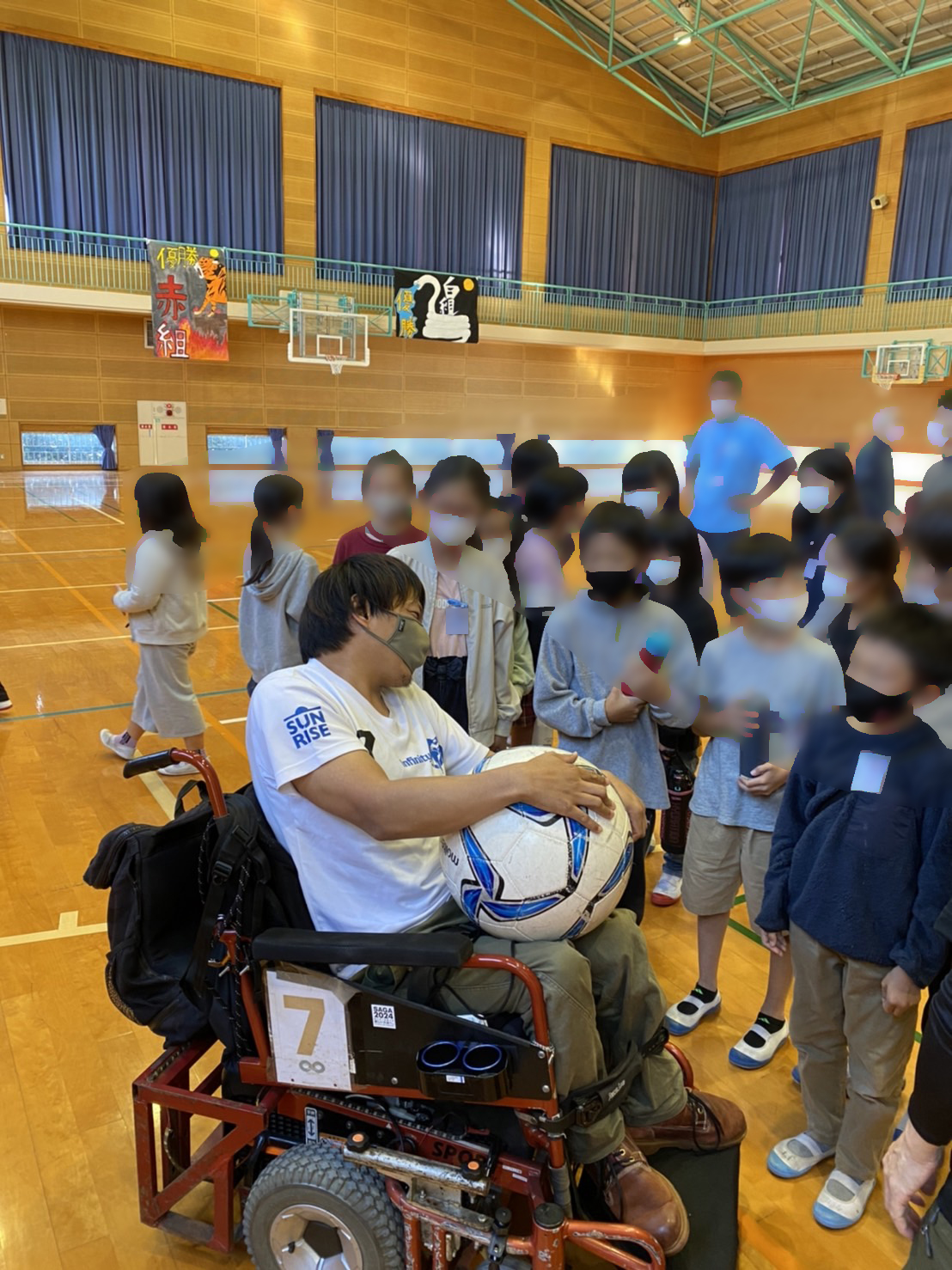 先日スポーツ協会から依頼を受けまして、諸富南小学校での講話をしてきました。講話自体はパラスポーツを通して、障がい当事者の理解にも繋がるようなそんな授業でした。主の目的は「ボッチャ・ゴールボール」を体験しようということでしたが、教会の計らいで、電動車いすサッカーも宣伝しよう!ということで、チームメイトが簡単な説明をして、私がパフォーマーとして、生徒にパスを出したり、回転キックをしてみたり、コーンを置いてその間にシュートをしてみたりとしていました。ゴールに上手く入ると拍手! すごく自然に歓声も聞こえたのが嬉しかったな。